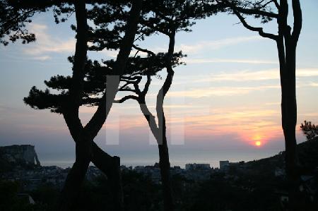 Blick auf Etretat und das Meer bei Sonnenuntergang