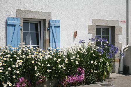 Blumen vor einem Haus auf der Ile de Batz, Bretagne