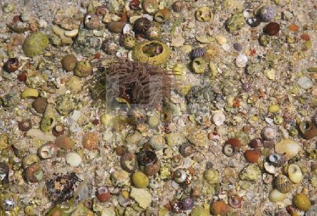 Seeanemone zwischen Muscheln bei Niedrigwasser, Bretagne